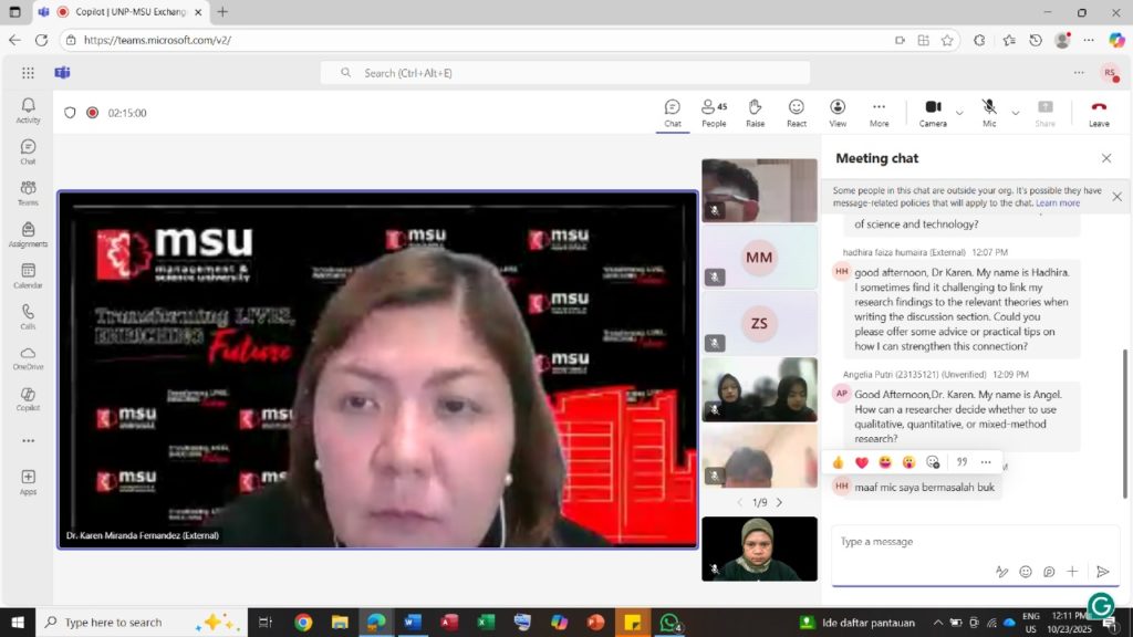 Padang, 24 Oktober 2024 — Departemen Pariwisata Fakultas Pariwisata dan Perhotelan Universitas Negeri Padang (UNP) kembali memperkuat kerja sama internasionalnya melalui kegiatan MSU–UNP Staff Exchange Online bersama Management and Science University (MSU), Malaysia.