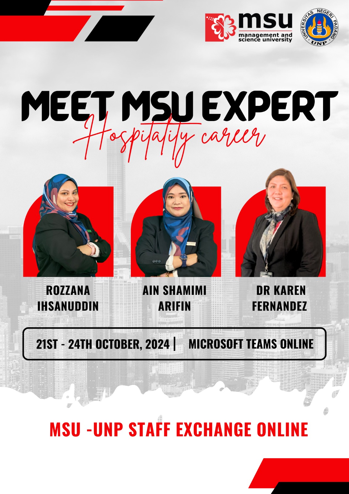 Kegiatan bertajuk “Meet MSU Expert: Hospitality Career” ini dilaksanakan secara daring melalui Microsoft Teams pada tanggal 21–24 Oktober 2024. Program ini menghadirkan lima pakar dari bidang perhotelan MSU yang berbagi wawasan dan pengalaman terkait karier di dunia hospitality.