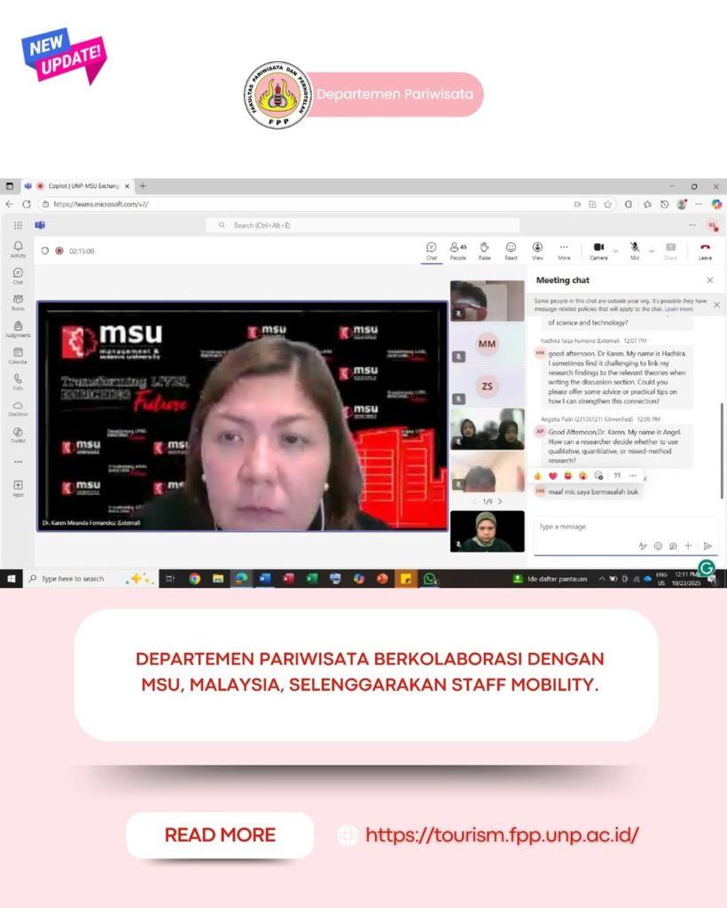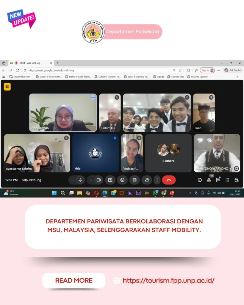 Pada semester Juli–Desember 2025, Departemen Pariwisata Fakultas Pariwisata dan Perhotelan Universitas Negeri Padang kembali melaksanakan program international exposure dan kerja sama akademik dengan salah satu perguruan tinggi pariwisata terbaik di Malaysia, yakni MSU. Melalui kegiatan ini, sejumlah dosen MSU hadir mengajar pada kelas-kelas di Program Studi D4 Manajemen Perhotelan (Kampus Utama), S1 Pariwisata, serta D4 Manajemen Perhotelan PSDKU Payakumbuh. Sebaliknya, dosen-dosen Departemen Pariwisata UNP juga memberikan pengajaran pada berbagai program studi di School of Hospitality and Creative Arts, MSU Malaysia.