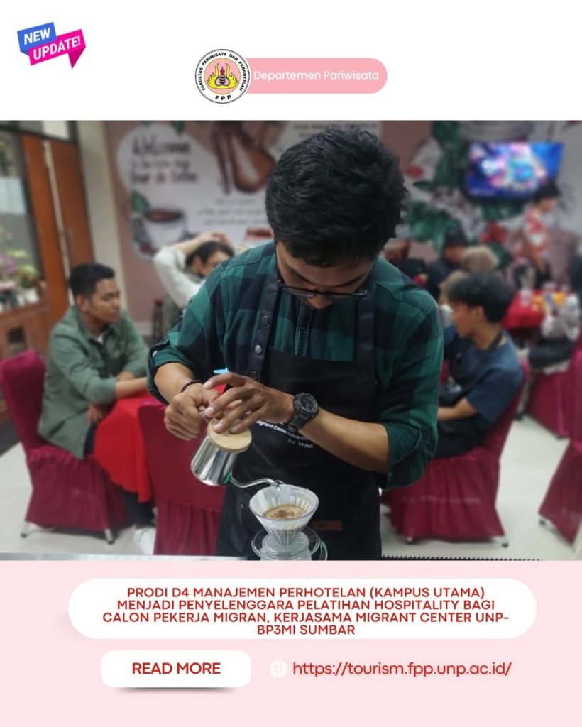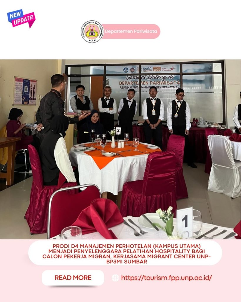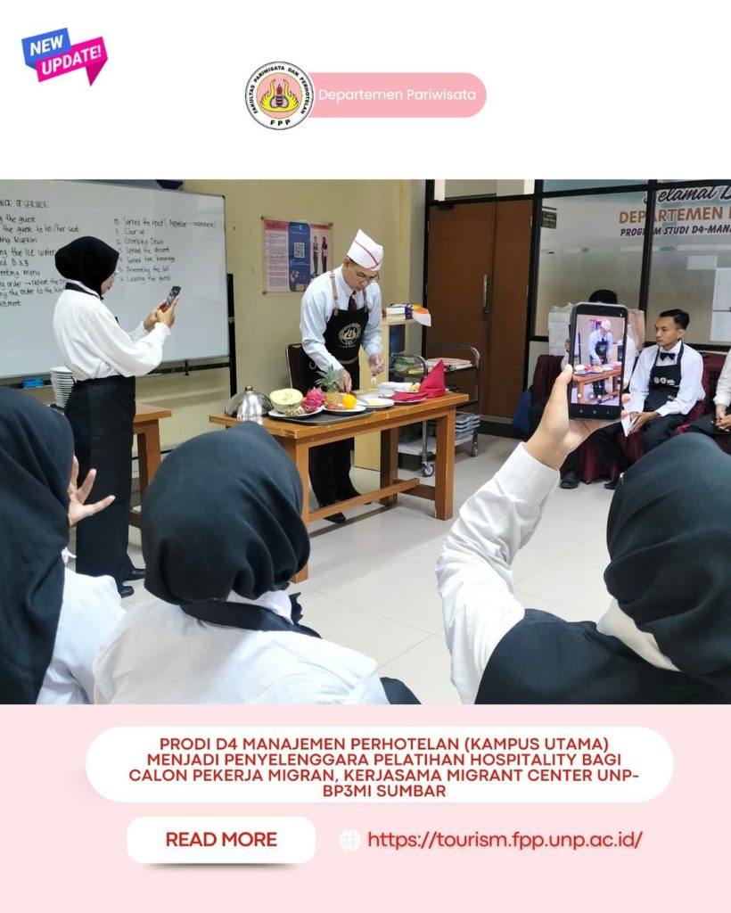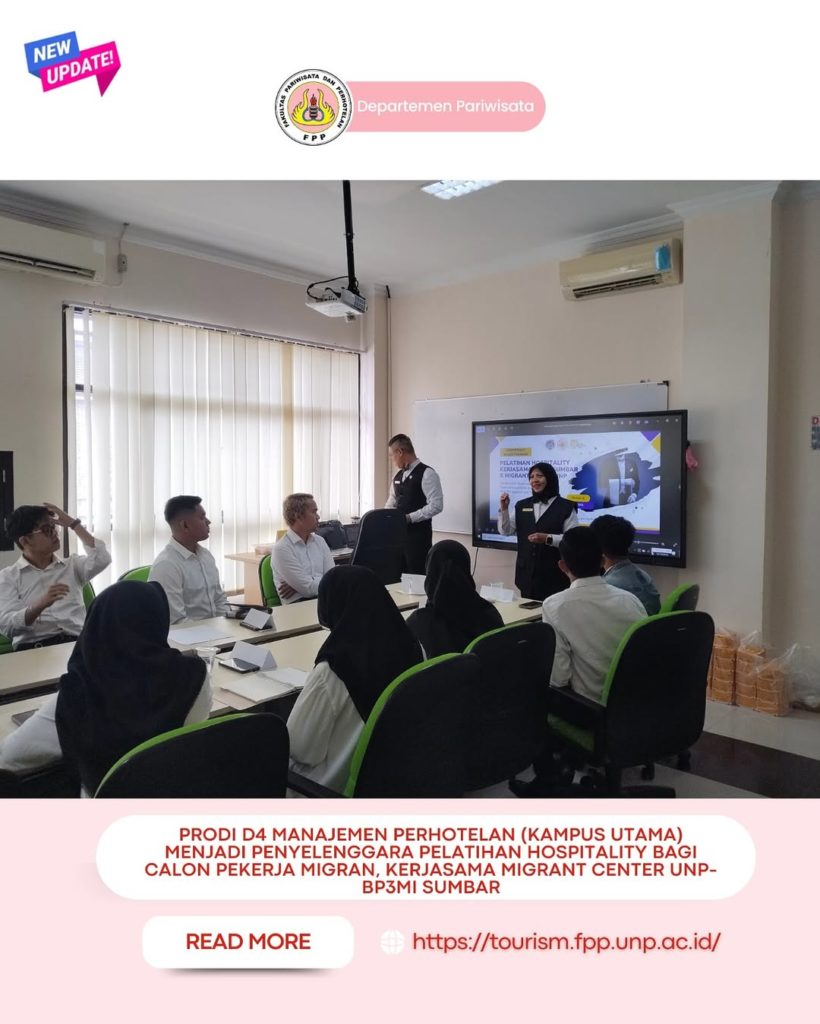 Akademik Departemen Pariwisata Menjadi Penyelenggara Pelatihan Hospitality Bagi Calon Pekerja Migrant Center UNP – BP3MI SUMBAR 20 November 2025 /