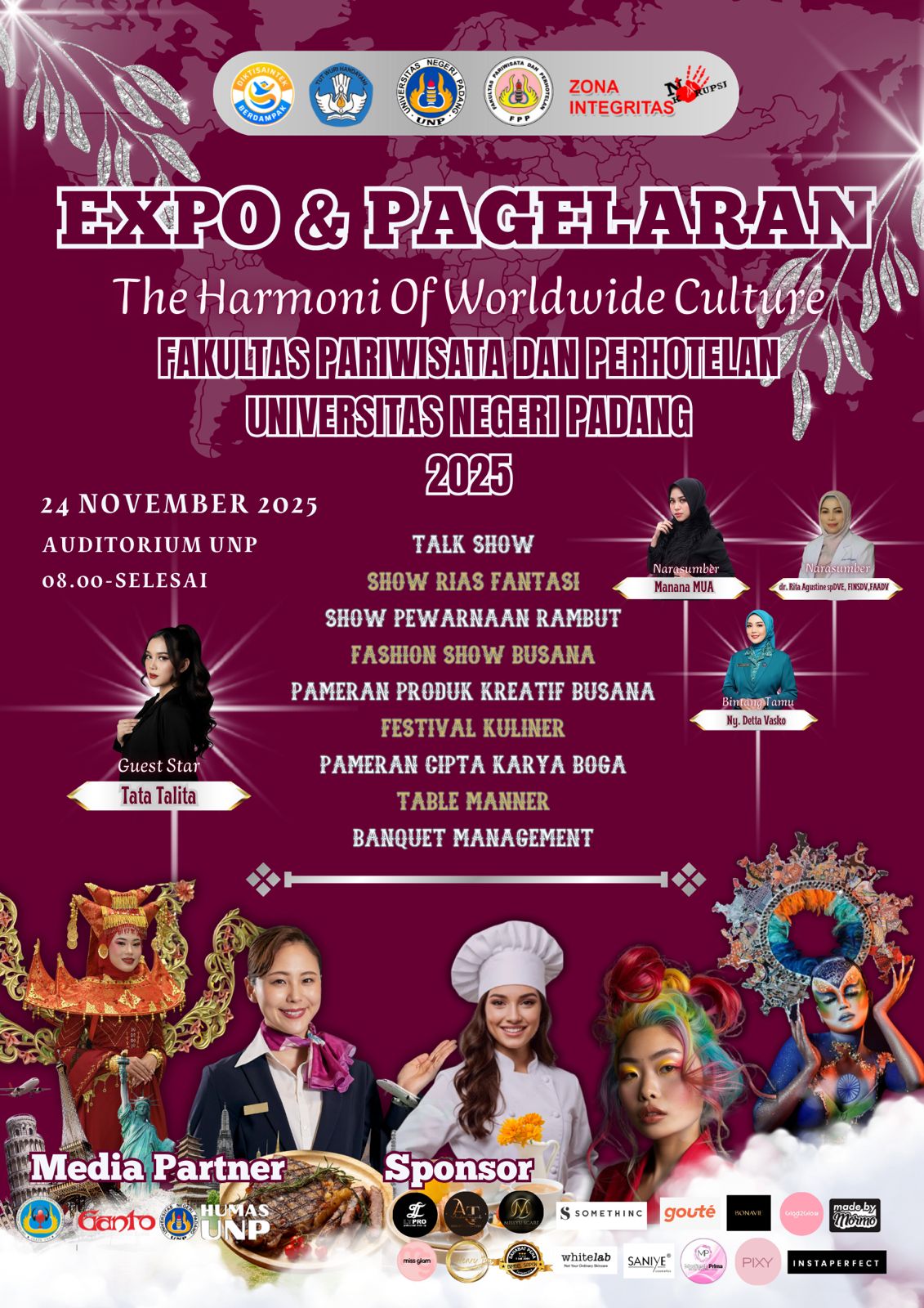 Padang — Mahasiswa Departemen Pariwisata Fakultas Pariwisata dan Perhotelan Universitas Negeri Padang (FPP UNP) mendapat kepercayaan sebagai Event Organizer (EO) dalam penyelenggaraan Expo dan Pagelaran FPP UNP 2025 yang mengusung tema “The Harmony of Worldwide Cultures” di Auditorium Kampus Air Tawar UNP, Senin (24/11/2025).